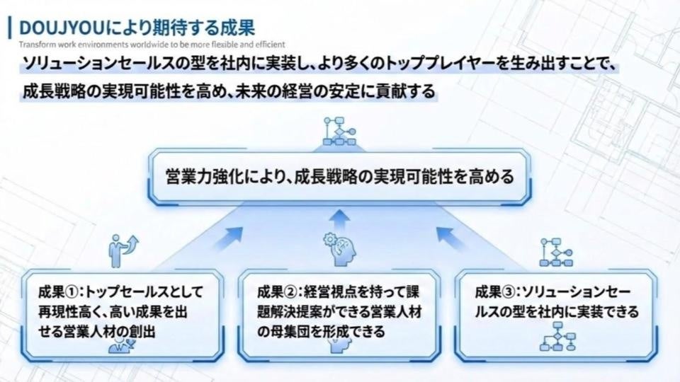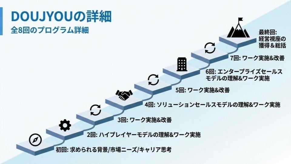 「DOUJYOU」は、代表の山田がキーエンス、エムスリー、タイミーなどの急成長企業でトップセールスや事業立ち上げ・事業グロースを経験する中で体系化した、独自のソリューションセールスモデル(型)を組織に定着させるコミット型のプログラムです。