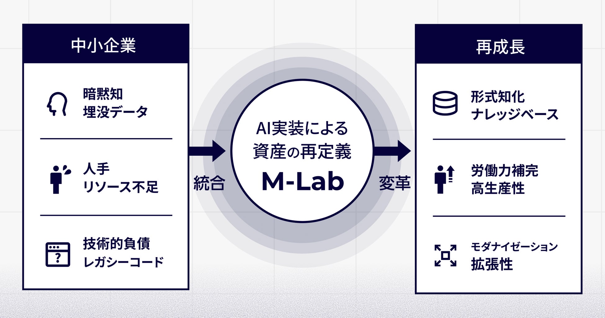 当社は「M-Lab」の設立により、企業が大切に育ててきたソフトウェアをAIによって現代、そして未来に最適化された形へとアップデートします。これまでの歴史に敬意を払いながら、最新テクノロジーを掛け合わせることで資産を次世代へと繋ぐ役割を強化していきます。