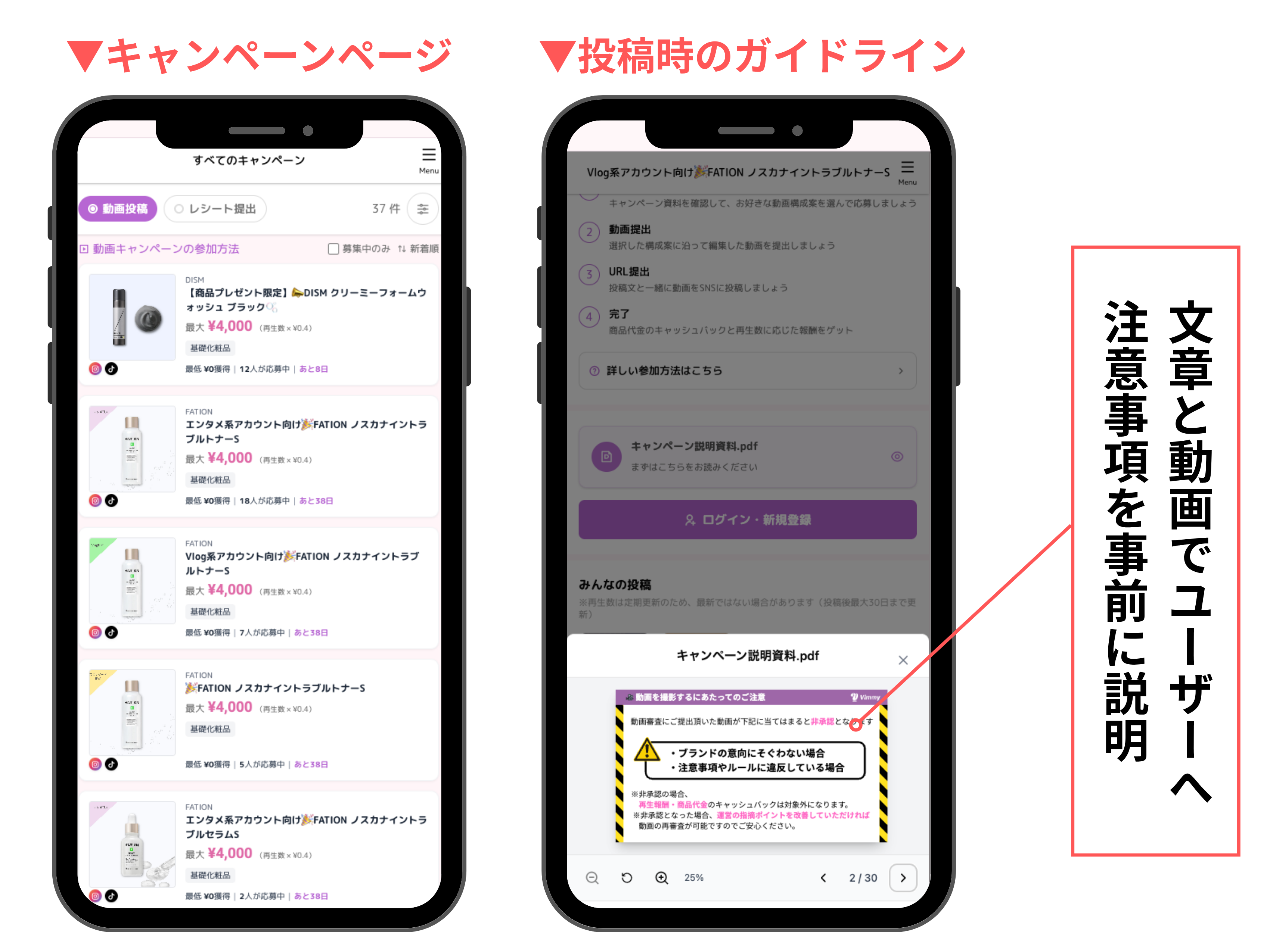 などを動画と文章で事前に共有することで、一定の品質を担保したUGC投稿を実現します。