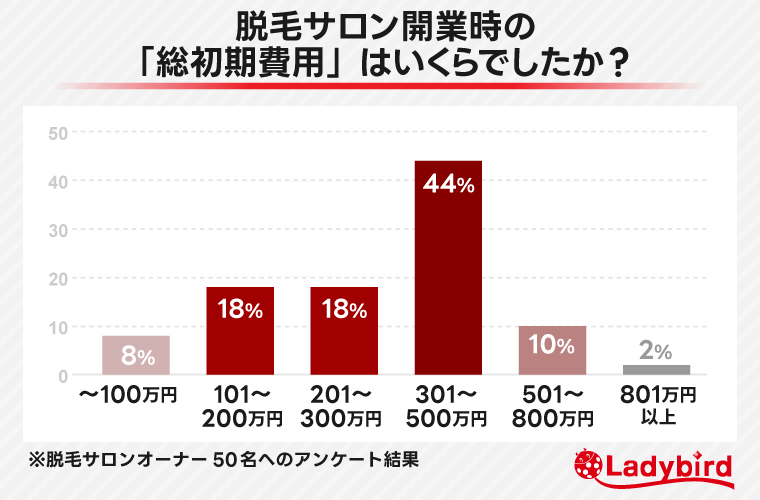 脱毛機・内装・物件・広告など含む初期費用の総額として最も多いのは「301〜500万円」で、全体の44%を占める結果となりました。