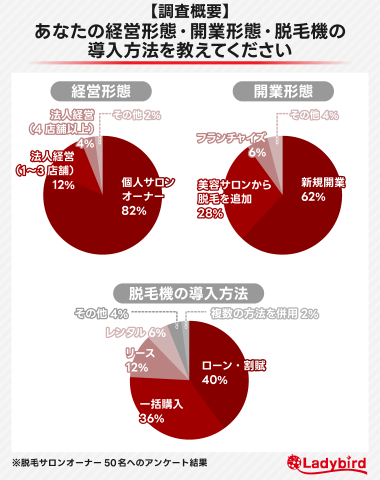 「あなたの人生に驚きと笑顔を創る」をミッションに、業務用美容機器開発・製造・販売・卸業、エステ商材販売、サロン運営支援をしている株式会社レディーバード(本社:東京都品川区、代表取締役社長 横沢直希、以下、当社)は、脱毛サロン関係者を対象に「業務用脱毛器の導入費と開業コストに関する調査」を実施しました。