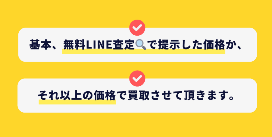 🟡無料LINE査定:基本即日か、査定のお客様が多い場合は、次の日までに査定いたします。