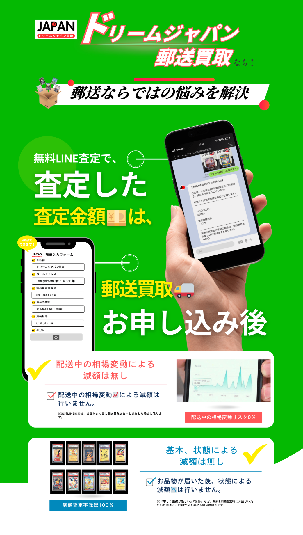 郵送中の相場変動による減額も、状態による減額も行いません。