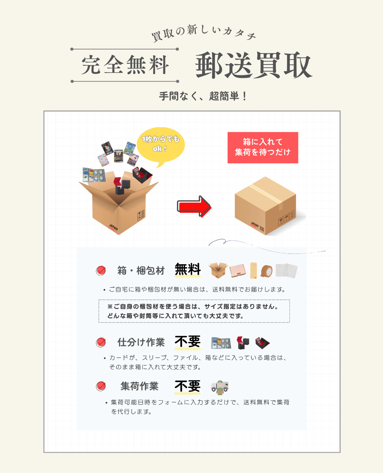 ※カードがスリーブやファイルなどに入っている場合は、仕分け無しでそのまま箱に入れて送っても大丈夫です。