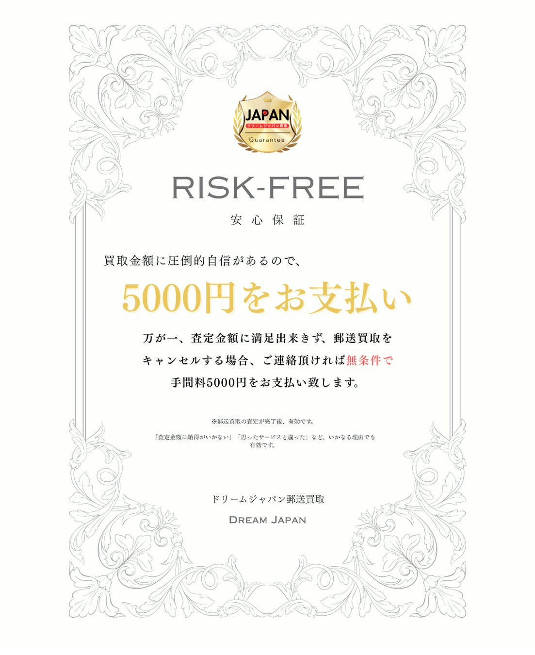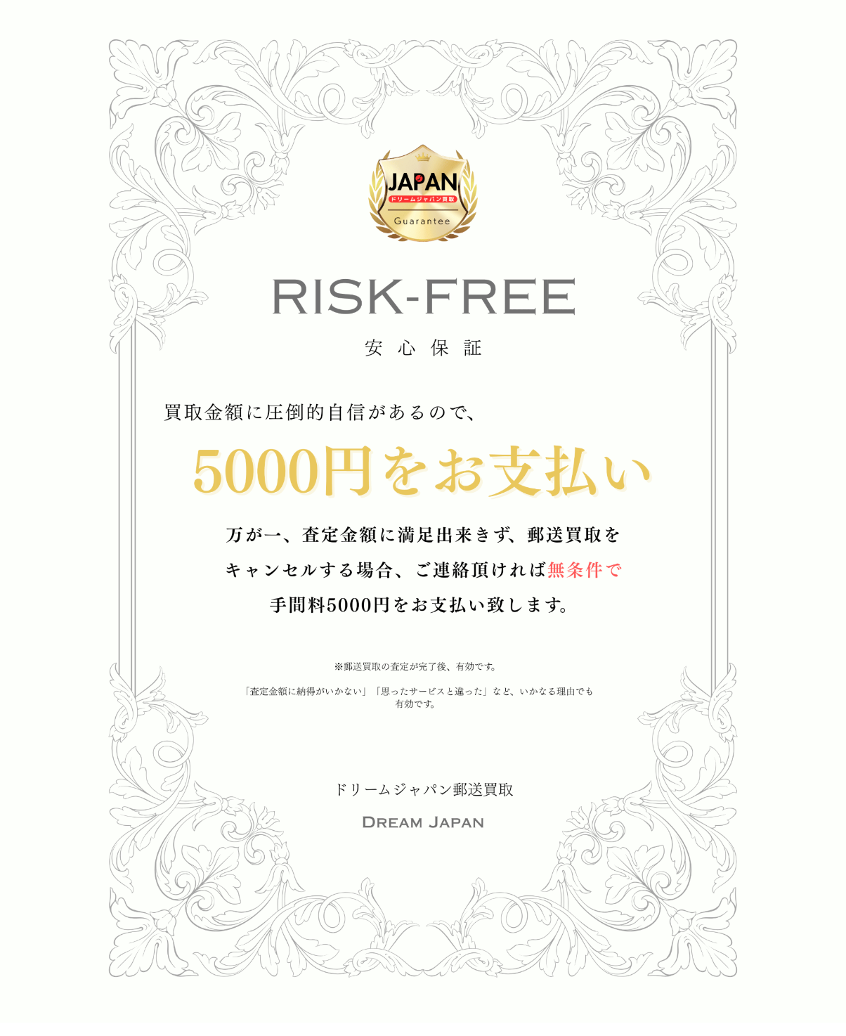 【業界初】郵送買取の査定が完了後、万が一、査定金額に満足出来きず、郵送買取をキャンセルする場合、ご連絡頂ければ無条件で手間料5000円をお支払い致します。