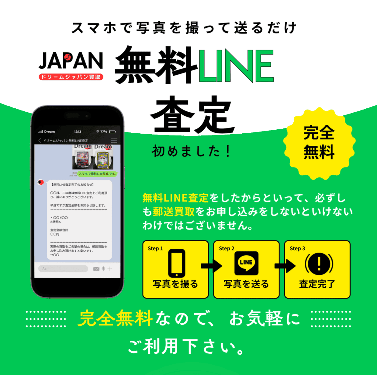 LINEにポケモンカードの写真か名前をお送り頂ければ、無料で査定金額を出すことが可能です。