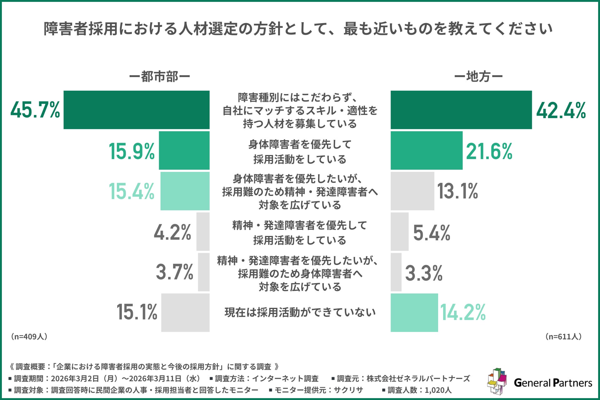 株式会社ゼネラルパートナーズ(所在地:東京都千代田区、代表取締役社長:進藤 均)は、民間企業の人事・採用担当者を対象に、「企業における障害者採用の実態と今後の採用方針」に関する調査を行いました。