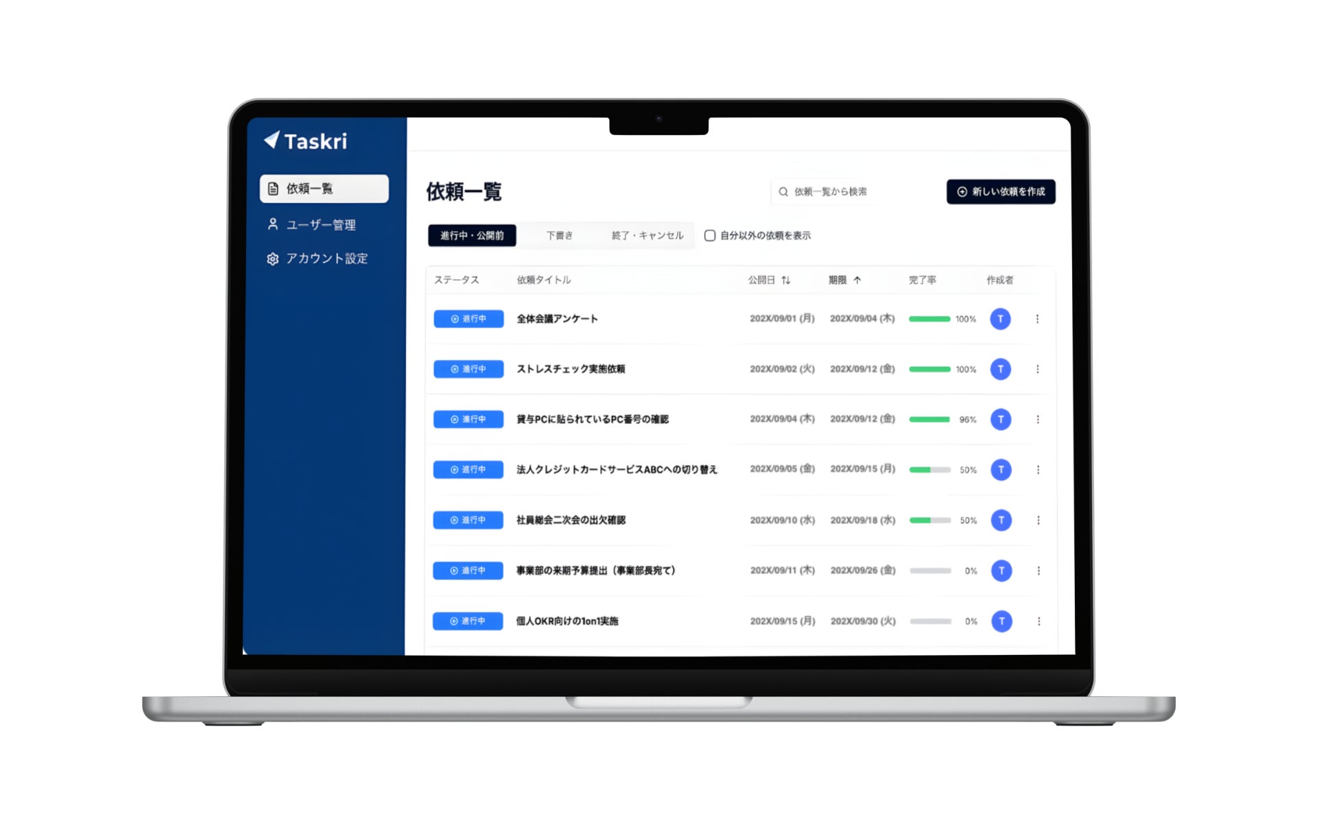 未対応者への催促が続くと、言う側も言われる側もストレスが積み上がります。Taskriは、依頼全体の進捗管理とリマインドをシステムで自動化することで、催促の手間と気まずさを減らし、社内の人間関係を損なわずに本来の業務に集中できる時間を取り戻します。