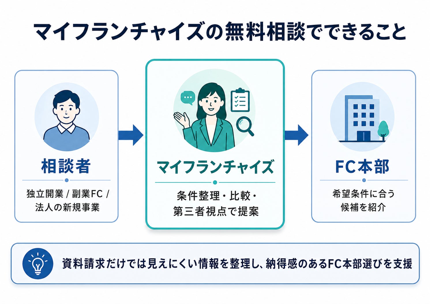「マイフランチャイズ」は、フランチャイズ加盟を検討する方に向けて、FC本部選びを第三者視点でサポートする無料相談サービスです。
