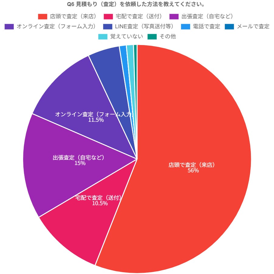 見積もり(査定)の依頼方法は、「店頭で査定(来店)」56%が最多。次いで「出張査定」15%、「オンライン査定(フォーム入力)」11.5%、「宅配査定」10.5%。