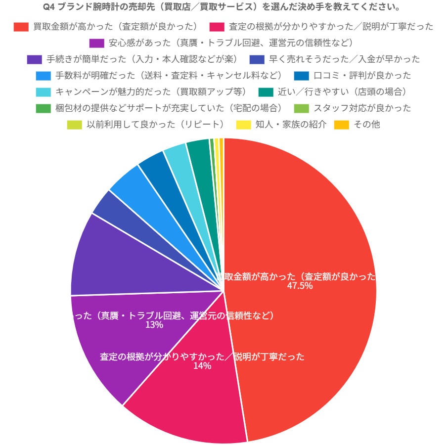 売却先を選んだ決め手は、「買取金額が高かった(査定額が良かった)」が47.5%で最多。次いで「査定の根拠が分かりやすい/説明が丁寧」14%、「安心感(真贋・トラブル回避、運営元の信頼性など)」13%。
