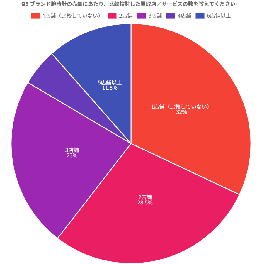 「1店舗(比較していない)」は32%にとどまり、約7割が複数の買取店/サービスを比較して売却先を決めている実態がうかがえます。