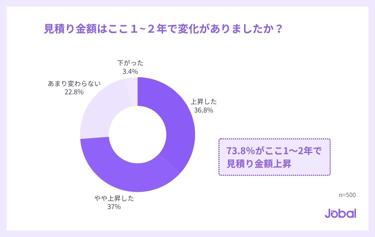 ここ1〜2年の見積金額の変化について質問したところ、「上昇した(36.8%)」「やや上昇した(37.0%)」と回答した企業は合計73.8%となり、多くの企業がすでに施工費の上昇を実感していることが分かりました。
