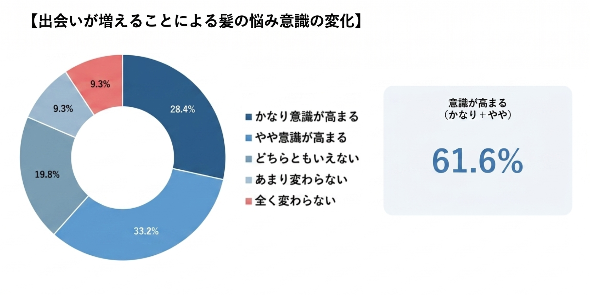 新しい人との出会いや人前に出る機会が増えることで、髪・頭皮の悩みに対する意識が変わるか尋ねたところ、「かなり意識が高まる」28.4%(119名)、「やや意識が高まる」33.2%(139名)と、合算6割超(61.6%・258名)が「意識が高まる」と回答しました。