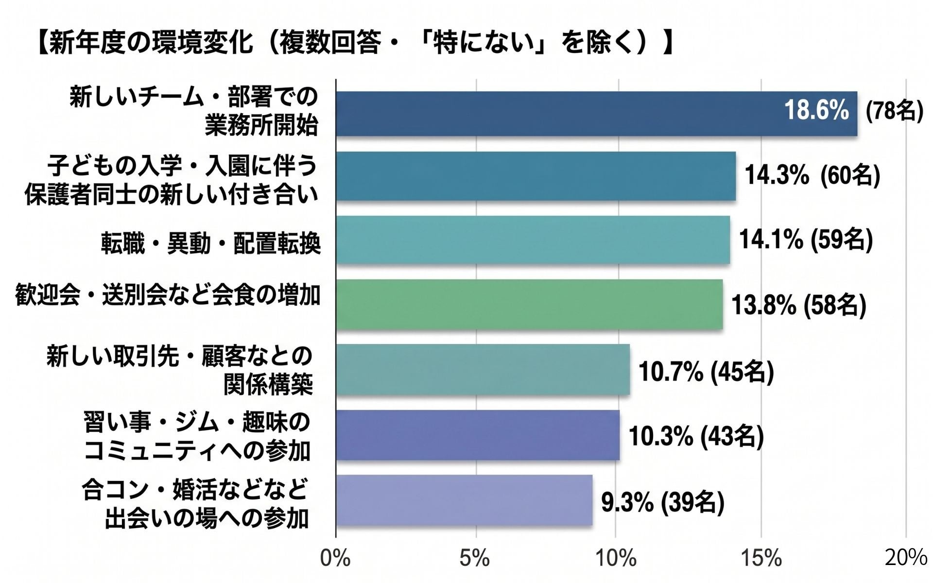 具体的には、「新しいチーム・部署での業務開始」18.6%(78名)、「子どもの入学・入園に伴う保護者同士の新しい付き合い」14.3%(60名)、「転職・異動・配置転換」14.1%(59名)が上位となりました。仕事上の変化に加え、プライベートでも新しい人間関係が始まる時期であることが見て取れます。