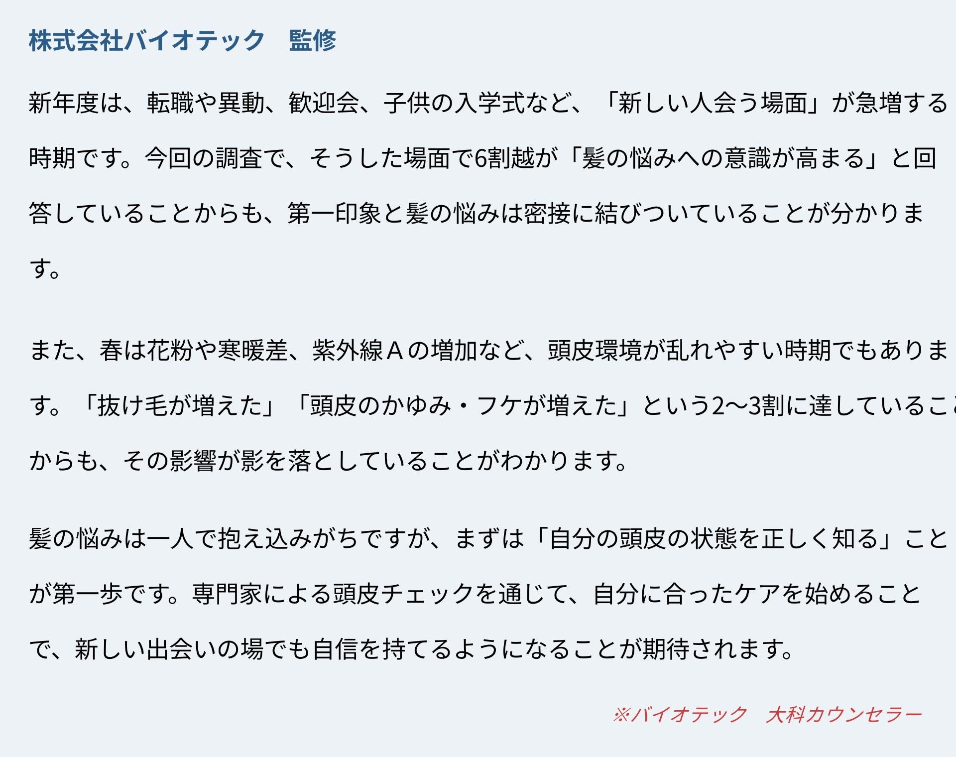 バイオテックでは、頭皮チェック・カウンセリングを実施しており、季節の変化(紫外線A増加・花粉・環境変化ストレス)が頭皮に与える影響も含め、専門家と一緒に自分に合ったケアプランを設計できます。 新しい出会いの場で自信を持つために、まずはご自身の頭皮チェックから始めてみませんか。