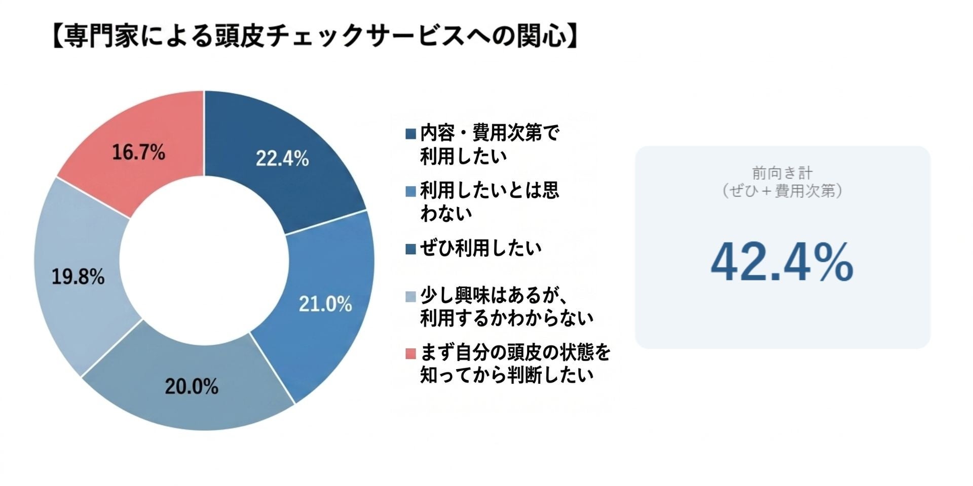 頭皮や髪の状態を専門家にチェックしてもらい、自分に合ったケアプランを提案してもらえるサービスがあればどう思うか尋ねたところ、「ぜひ利用したい」20.0%(84名)、「内容・費用次第で利用したい」22.4%(94名)、「まず自分の頭皮の状態を知ってから判断したい」16.7%(70名)と、合算約6割(59.2%・248名)が前向きな姿勢を示しました。