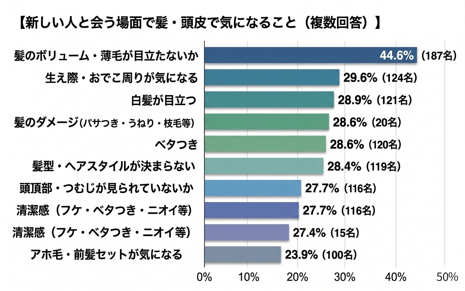 新しい人と会う場面で、髪や頭皮について気になることを尋ねたところ、「髪のボリューム・薄毛が目立たないか」が44.6%(187名)で最多となりました。「生え際・おでこ周りが気になる」29.6%(124名)、「白髪が目立つ」28.9%(121名)が続きます。