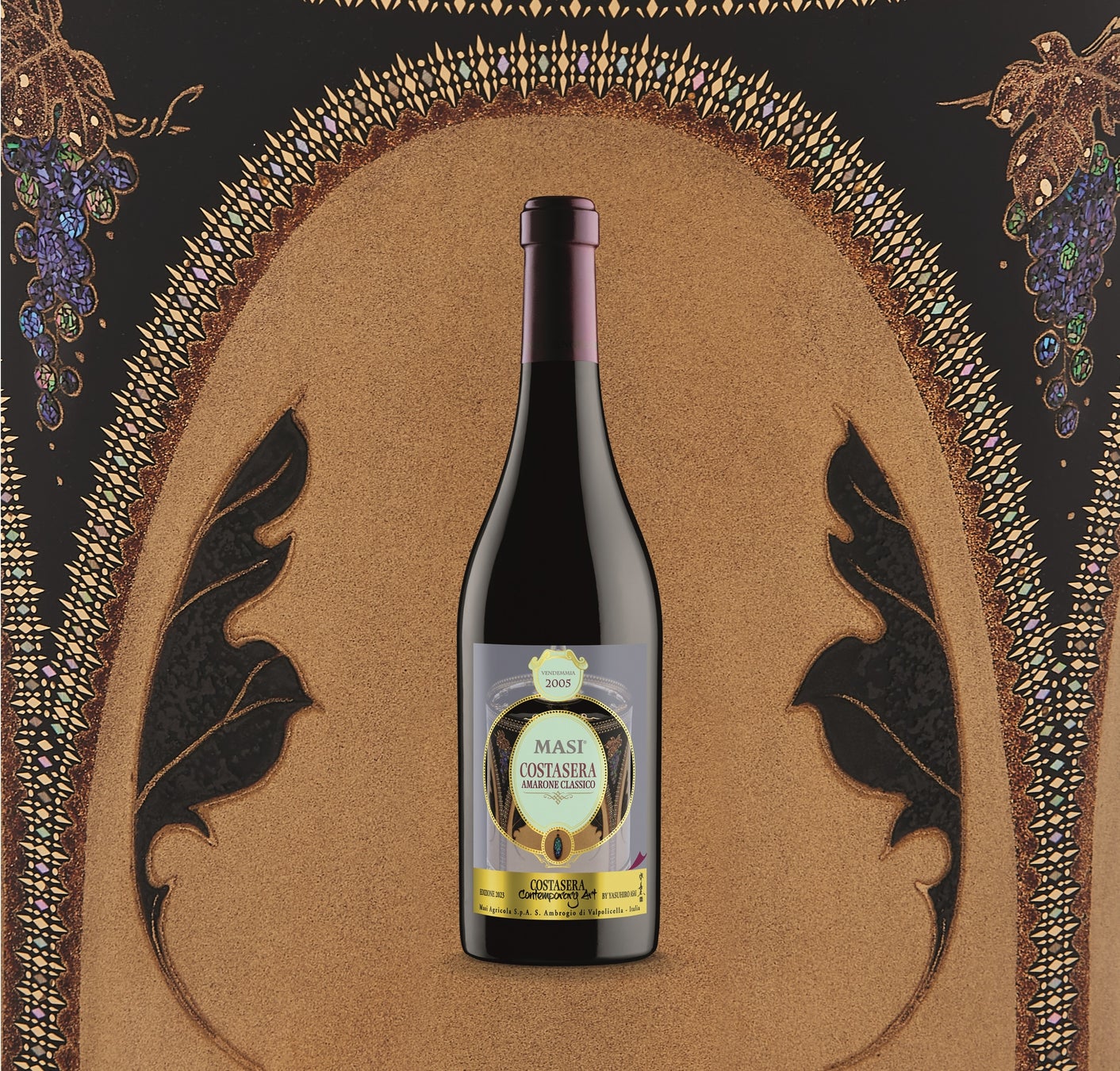マァジ社は、同社と縁の深い国から世界で活躍するアーティストを選出し、マァジ社を代表するコスタセラ・アマローネにインスパイアされた作品をボスカイーニ家のプライベートセラーに眠る秀逸なオールドヴィンテージをアートラベルにして限定発売するプロジェクトである「コスタセラ・コンテンポラリー・アート」を2013年から二年に一度発表しています。これまで、スウェーデン、スイス、カナダ、中国、ロシアのアーティストのデザインが採用されてきましたが、2023年版として、日本の漆工芸の専門家である浅井康宏氏が選ばれました。今回のアートボトルに採用されたのは、浅井氏による蒔絵螺鈿香炉「西香」(さいこう)と題された香炉で、そのデザインがラベルに映し出されています。