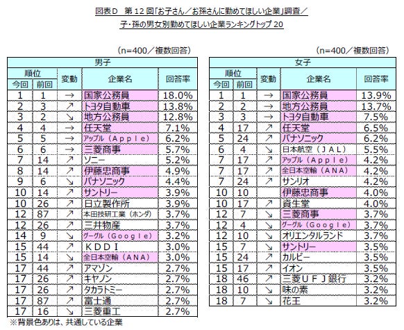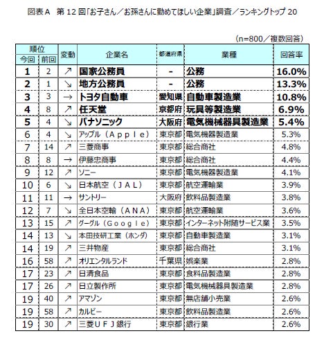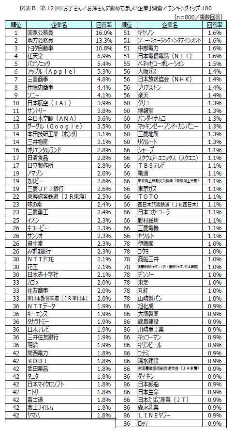 第12回「お子さん/お孫さんに勤めてほしい企業」調査のランキング1位は「国家公務員」(回答率16.0%)となりました。次いで2位「地方公務員」(同13.3%)、3位「トヨタ自動車」(同10.8%)、4位「任天堂」(同6.9%)、5位「パナソニック」(同5.4%)、6位「アップル(Apple)」(同5.3%)、7位「三菱商事」(同4.8%)、8位「伊藤忠商事」(同4.4%)、9位「ソニー」(同4.1%)、10位「日本航空(JAL)」(同3.9%)と続きました。