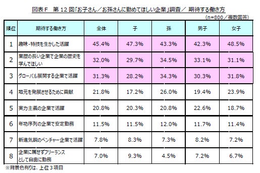 また、子・孫に期待する働き方を調査したところ、1位「趣味・特技を生かした活躍」(回答率45.4%)、2位「業歴の長い企業で企業の歴史を学んでほしい」(同32.0%)、3位「グローバル展開する企業での活躍」(同31.3%)となり、1位の「趣味・特技を生かした活躍」は、子・孫別、男女別ともに圧倒的な回答率を得る結果となりました。(図表F)