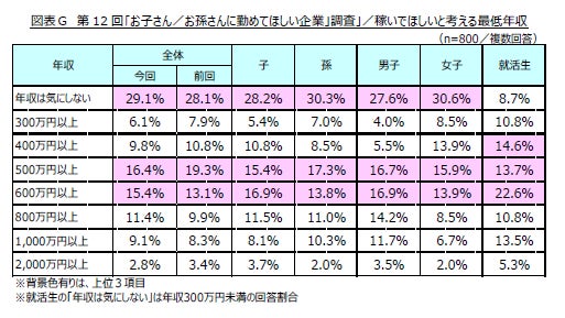 子・孫に勤めてほしい企業において、稼いでほしいと考える最低年収を調査したところ、「年収は気にしない」(回答率29.1%)が約3割を占め、最も多い回答となり、以下2位「500万円以上」(同 16.4%)、3位「600万円以上」(同 15.4%)と続きました。「年収は気にしない」以外では500万円前後に回答が集まっており、民間企業の平均年収が458万円(2022年版「民間給与実態統計調査」)であることや、重視するイメージにおいて「給与が高い」が5位とさほど重視されていないことを考慮すると、高収入への期待よりも人並みの収入を得て安定した生活をしてほしいと考える父母・祖父母が多い様子がうかがえます。2024年3月に実施した就職活動生向けの「第10回就職したい企業・業種ランキング」(以下、就活生ランキング)の結果においても、500万円前後の回答が多く、父母・祖父母の回答と共通した傾向がみられました。(図表G)