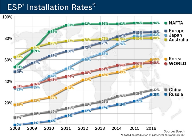 現在、世界のほぼ2台に1台の新車がESCを装備した状態で出荷されています。米国とヨーロッパでは法規制によって横滑り防止装置が一般的に標準装備となっており、日本やオーストラリアでも装備率が増加しています。その一方で、ブラジル、中国、インドやASEAN諸国のESC装備率はさほど高くありません。そのため、ボッシュはこれらの市場に向けて、最も重要な基本機能を装備した魅力的なエントリーレベルのバージョンも提供します。
