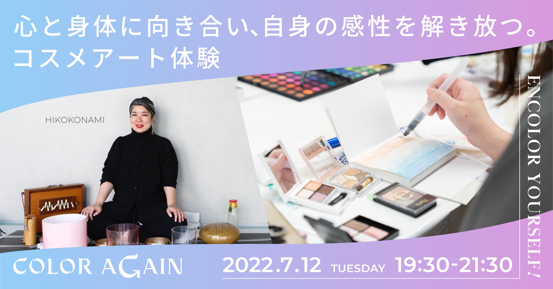 今回のイベントでは、自分の内側にある声に耳を傾け、自宅に眠っているご自身のコスメを活用しアートとして表現しながら、さまざまな人の価値観に触れることで自分の感性に気づけるだけでなく、最終的に自分に自信を持つことができるような体験をご提供します。前回ゲスト出演したHIKOKOMAMI氏が公式アンバサダーとして就任し、COLOR Againと共に一人ひとりの色を見つめ、その人らしさを取りもどす活動を行っていきます。
