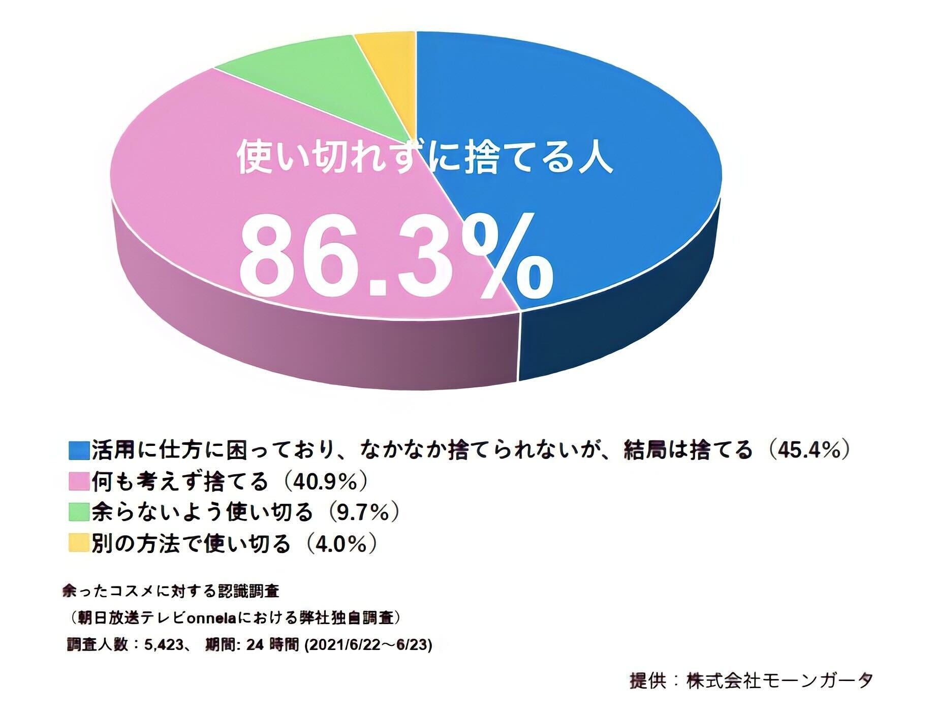 パートナーであるモーンガータ社が2021年6月に独自で行なった5,000人調査で、コスメを使い切れずに捨てるユーザーが86.3%いることが判明。また、開発途上や生産過程などで化粧品メーカーから出る化粧品の中身(バルク)の廃棄量は、国内上位5社だけで年間約2万トンもあることが独自調査から浮き彫りになりました。