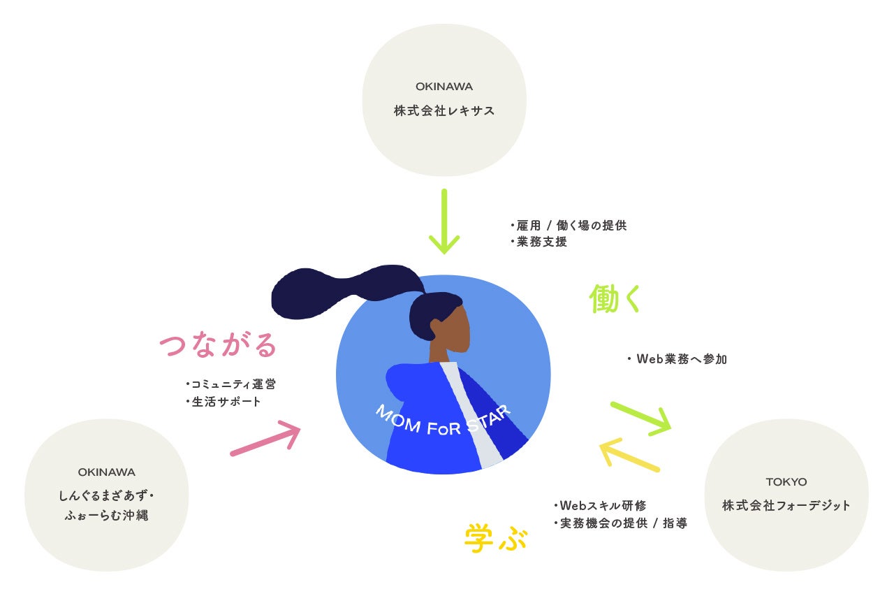 MOM FoR STARは、「学ぶ」「働く」「つながる」の3つの活動からなる、沖縄のシングルマザーのためのWebデザイン就業・協働プロジェクトです。東京と沖縄のデジタルデザイン企業、沖縄の支援団体が連携することにより、1年間のプログラムで未経験からスキルを習得し、Web業界で活躍できるまでをサポートします。このプロジェクトは公益財団法人オリオンビール奨学財団による資金分配事業、「沖縄シングルマザーの活躍推進基盤構築事業」の実行団体の1つとして採択されています。