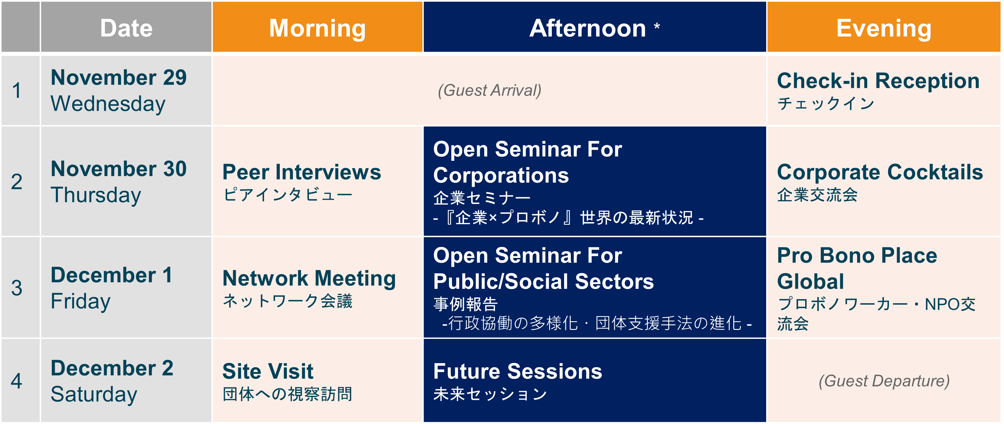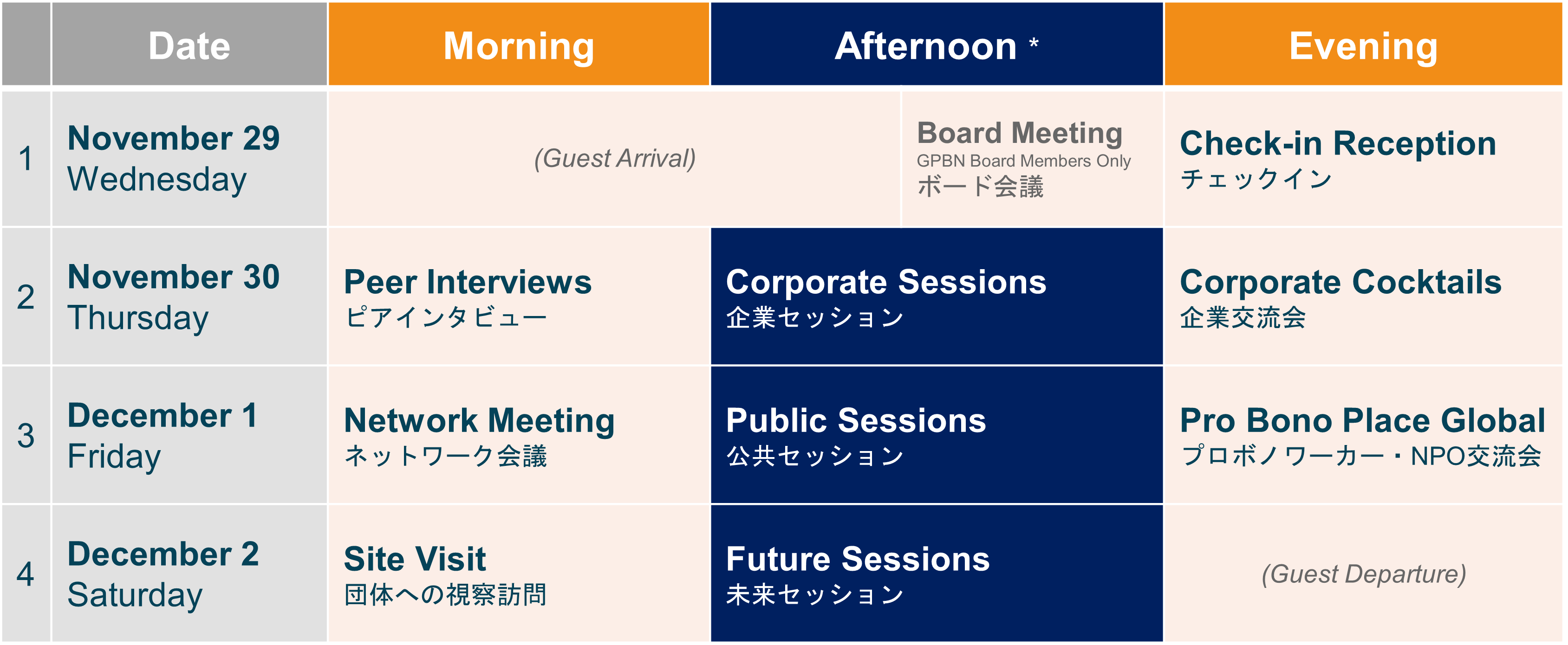 アジア、アフリカ、ヨーロッパ、北米、南米の各地からプロボノ運営団体のリーダーを東京に迎えるとともに、国内の企業、行政機関、学術機関等日頃からプロボノの推進に関わる多様なパートナーと共に、ここでしか見られない貴重なセッションを実施していきます。