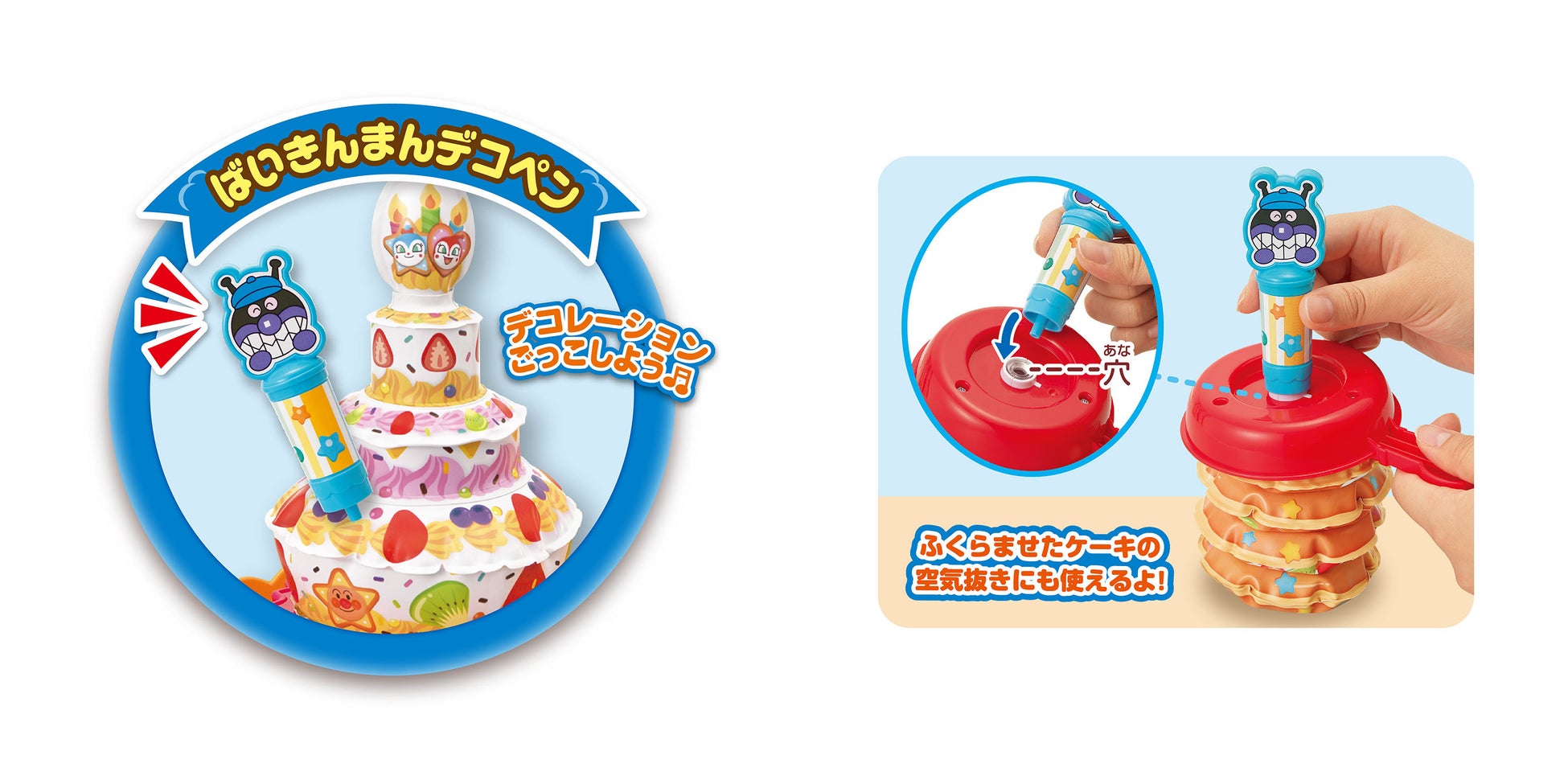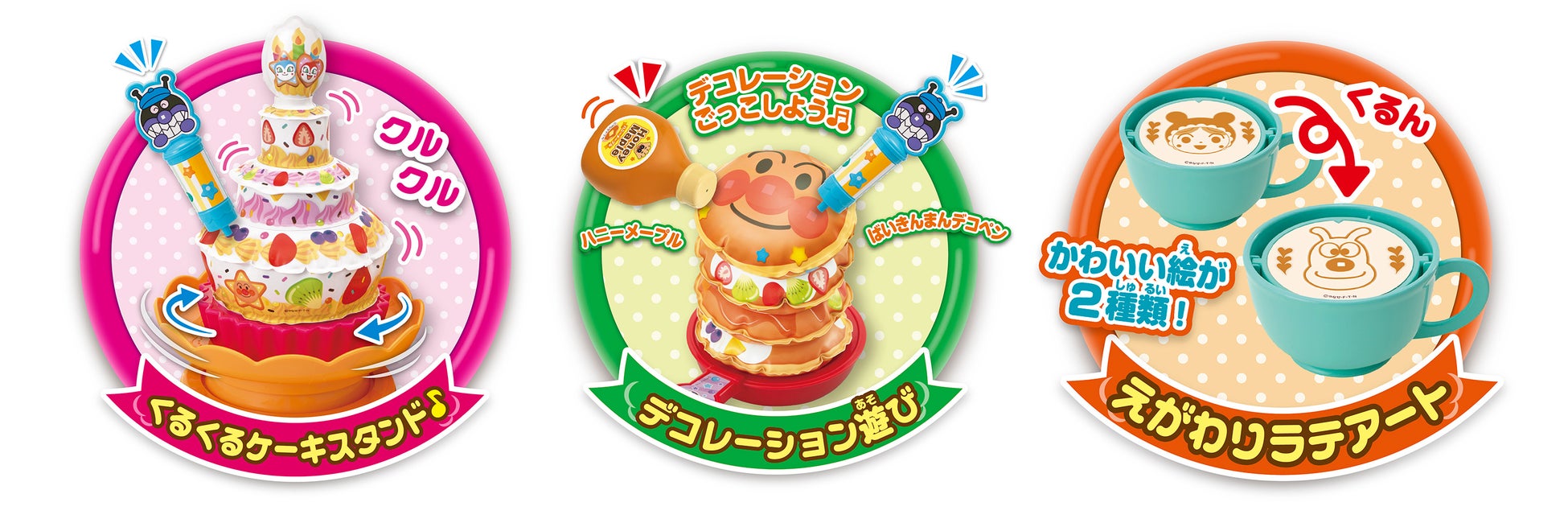 セット内容:本体、背板(紙製)、アンパンマンレリーフ、ふくらむパーツ(アンパンマンパンケーキ、バースデーケーキ)、くるくるケーキスタンド、えがわりラテアート、ばいきんまんデコペン、ハニーメープル、フォーク
