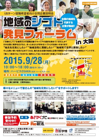 株式会社学情(本社:大阪市北区、代表取締役社長:中井清和)は、中小企業庁委託事業「UIJターン人材拠点事業(大阪)」の運営事務局として、UIJターン就職を目指す都市部の学生・若手社会人と日本全国各地域の企業・団体を結ぶ合同企業説明会「地域のシゴト発見フォーラムin大阪」を平成27年9月28日(月)に開催します。