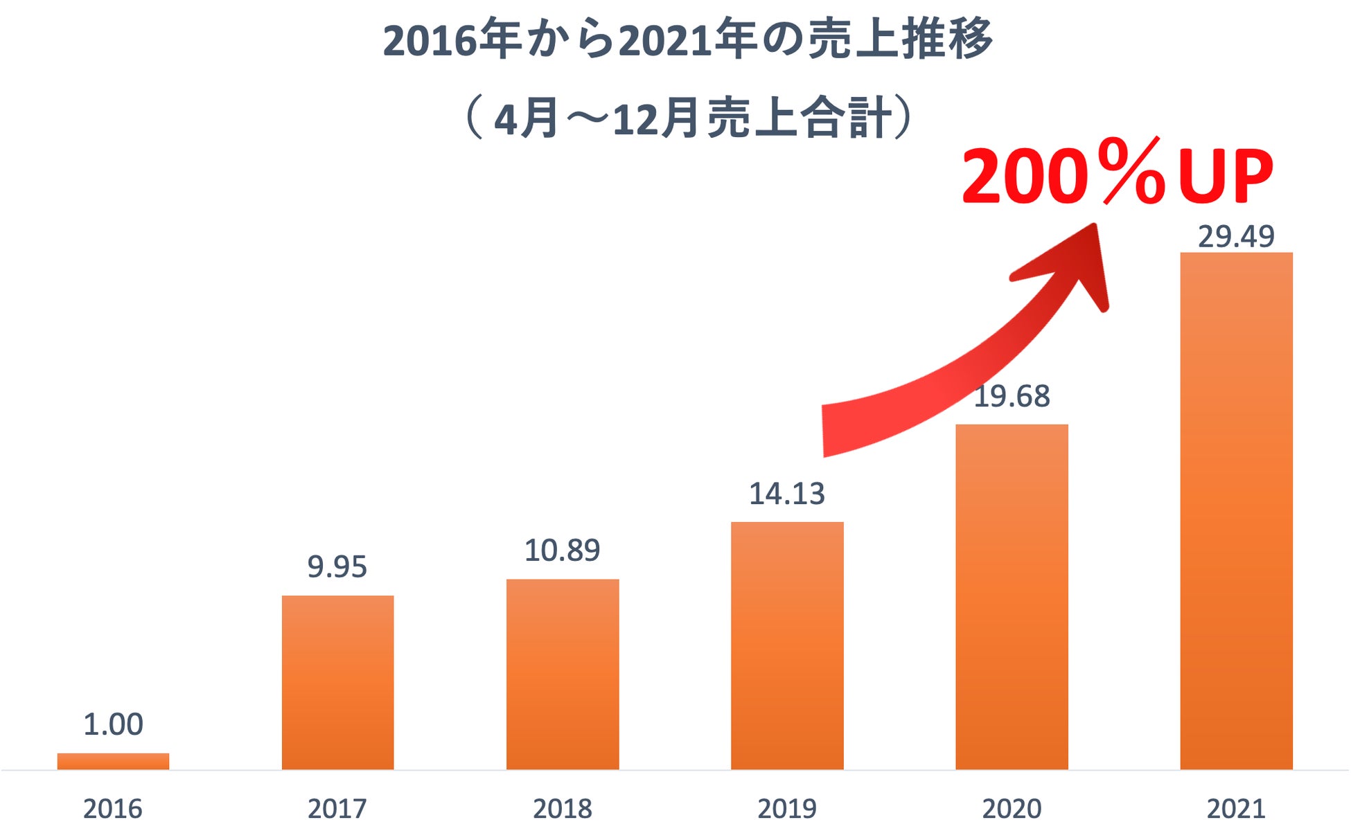 ※天使のたまご湘南鎌倉バースクリニック店は2016年に開設いたしました。毎年の4〜12月の合計売上を指数表示しております。