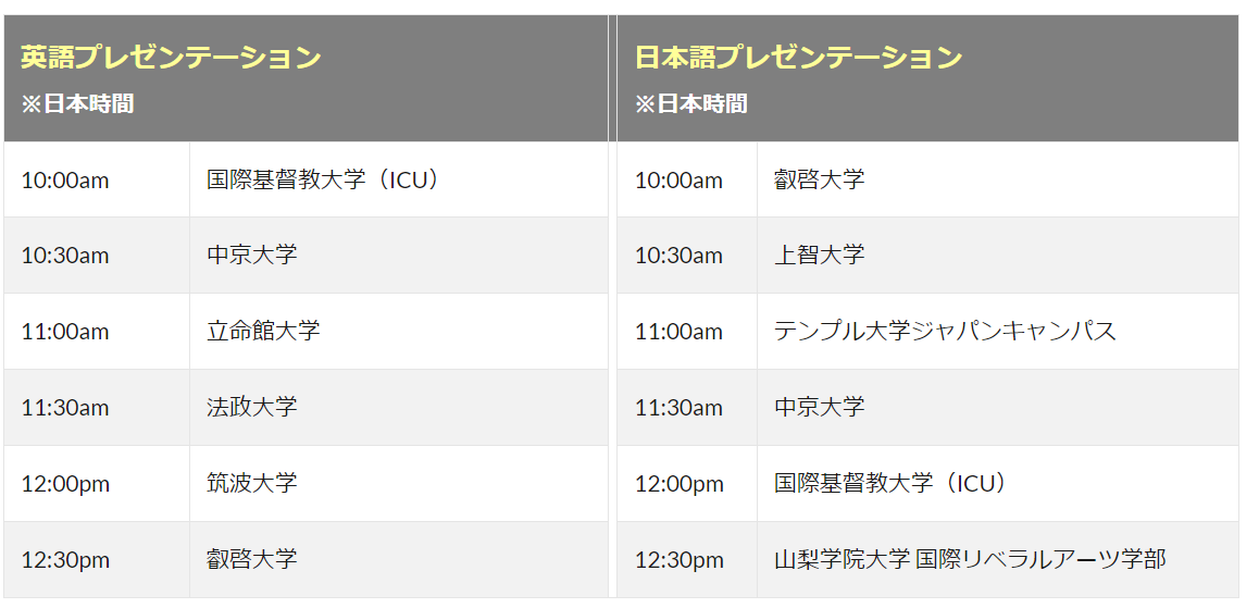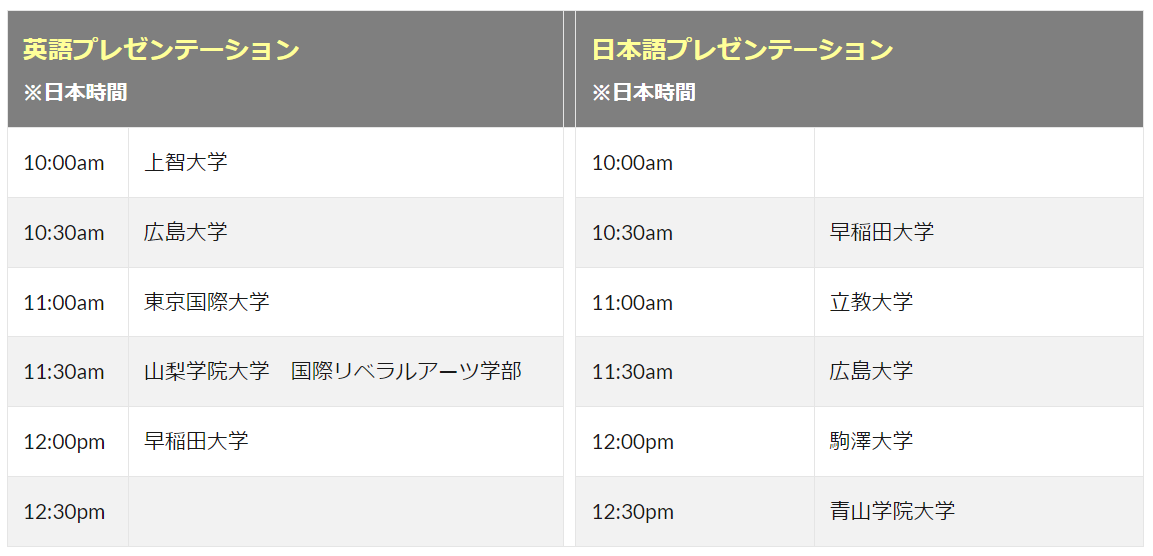 青山学院大学、叡啓大学、近畿大学、慶応義塾大学湘南藤沢キャンパス(SFC)、国際基督教大学(ICU)、駒澤大学、上智大学 、中京大学、筑波大学、津田塾大学、テンプル大学ジャパンキャンパス、東京国際大学、広島大学、法政大学、山梨学院大学国際リベラルアーツ学部 、横浜国立大学 、立教大学 、立命館大学、早稲田大学