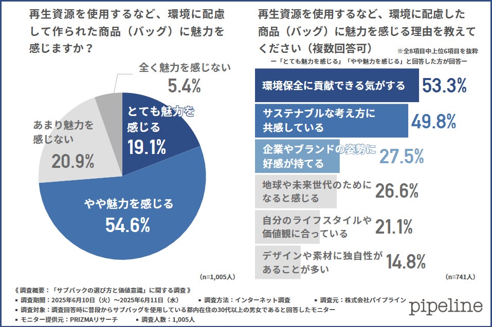 環境に配慮したバッグについては、全体の約7割が『魅力を感じる』と回答しており、多くの方がサステナブルな商品に関心を持っていることがわかりました。