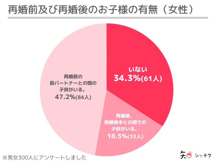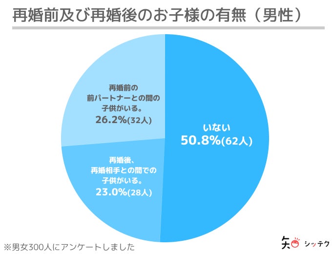 「再婚前及び再婚後のお子様の有無を教えてください 」と質問した所、「再婚前の前パートナーとの間の子供がいる」と回答した男性は26.2%、それに対して女性は47.2%程でした。女性においては約半数が前の配偶者との子供がいる状態のようです。