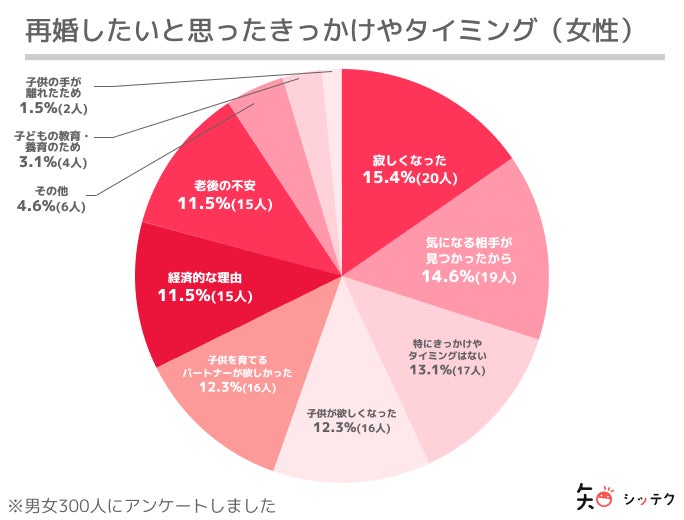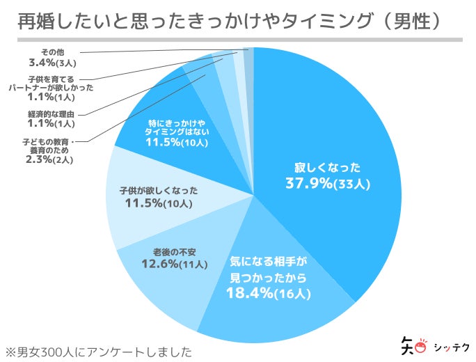 「再婚したいと思ったきっかけやタイミングを教えてください」と質問・回答を募ったところ、男性は「寂しさから」が37.9%でした。一方女性は「寂しさから」は15.4%で、「子供を育てるパートナーがほしくなった」12.3% (男性は1.1%)の回答等が目立ちました。男性の方が「孤独を感じている」傾向にあり、女性の方が現実主義な結果となりました。