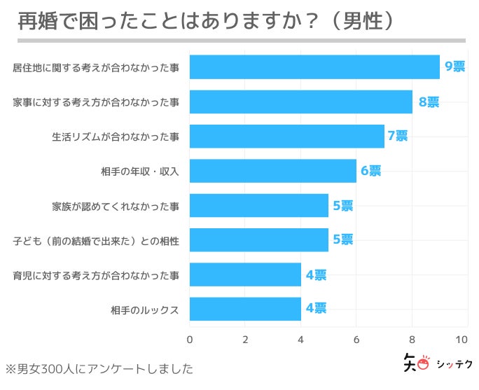 「再婚で困ったことはありますか。」と質問・回答を募ったところ、男性は「居住地に対する考えが合わなかった事」が最多でした。また、女性は「子ども(前の結婚で出来た)との相性」が最多であり、他にも相手の収入や年収に課題を抱えている傾向にありました。