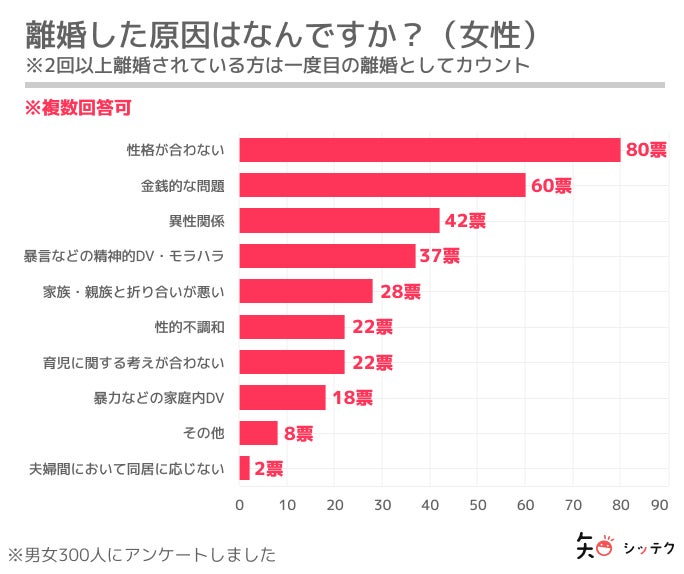 「離婚の原因はなんですか」と質問・回答を募ったところ、男女ともに「性格が合わない」が最多でした。また、男女共に「異性関係が理由で離婚した」という回答が多くありました。女性は、金銭的な問題が原因で離婚する事が多く、男性の借金やギャンブル等での使い込み、金銭感覚の違い等のトラブルがあるようです。