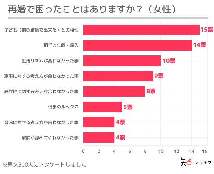 再婚で困ったこととして、女性は「前の結婚で出来た子供との相性」や「相手の収入」等が気になる傾向に