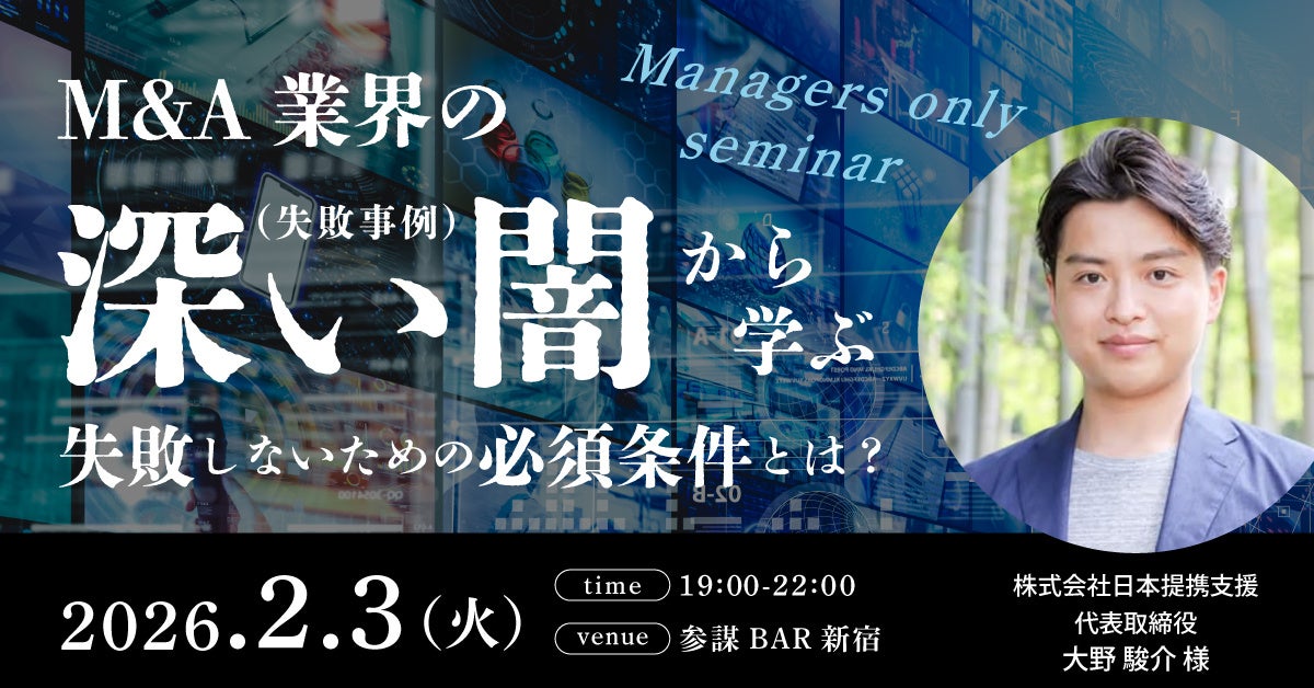 全国400社超の中小企業経営支援を行う株式会社経営参謀(本社:東京都港区、代表取締役:新谷 健司)が運営する経営者コミュニティ「参謀」は、2026年2月3日(火)19時より、経営者限定の勉強会『M&A業界の「深い闇(失敗事例)」から学ぶ、M&Aに失敗しないための必須条件』を開催いたします。 当日は、M&Aアドバイザリーとして多数の実績を持つ、株式会社日本提携支援 代表取締役の大野 駿介氏が登壇します。
