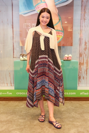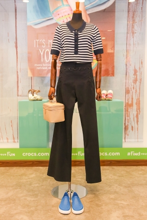 亀さんは今回のコーディネートレッスンをきっかけにクロックスのシューズを履いた時を振り返り「商品のバリエーションもテイストも多くて驚きました。コーディネートを作るのが楽しかったですし、軽さや履き心地は実際に履いてみると驚きを感じられる。」と話し、夏の色々なシチュエーションにあわせたコーディネートの楽しみ方を、6ルックのコーディネートを使って紹介しました。