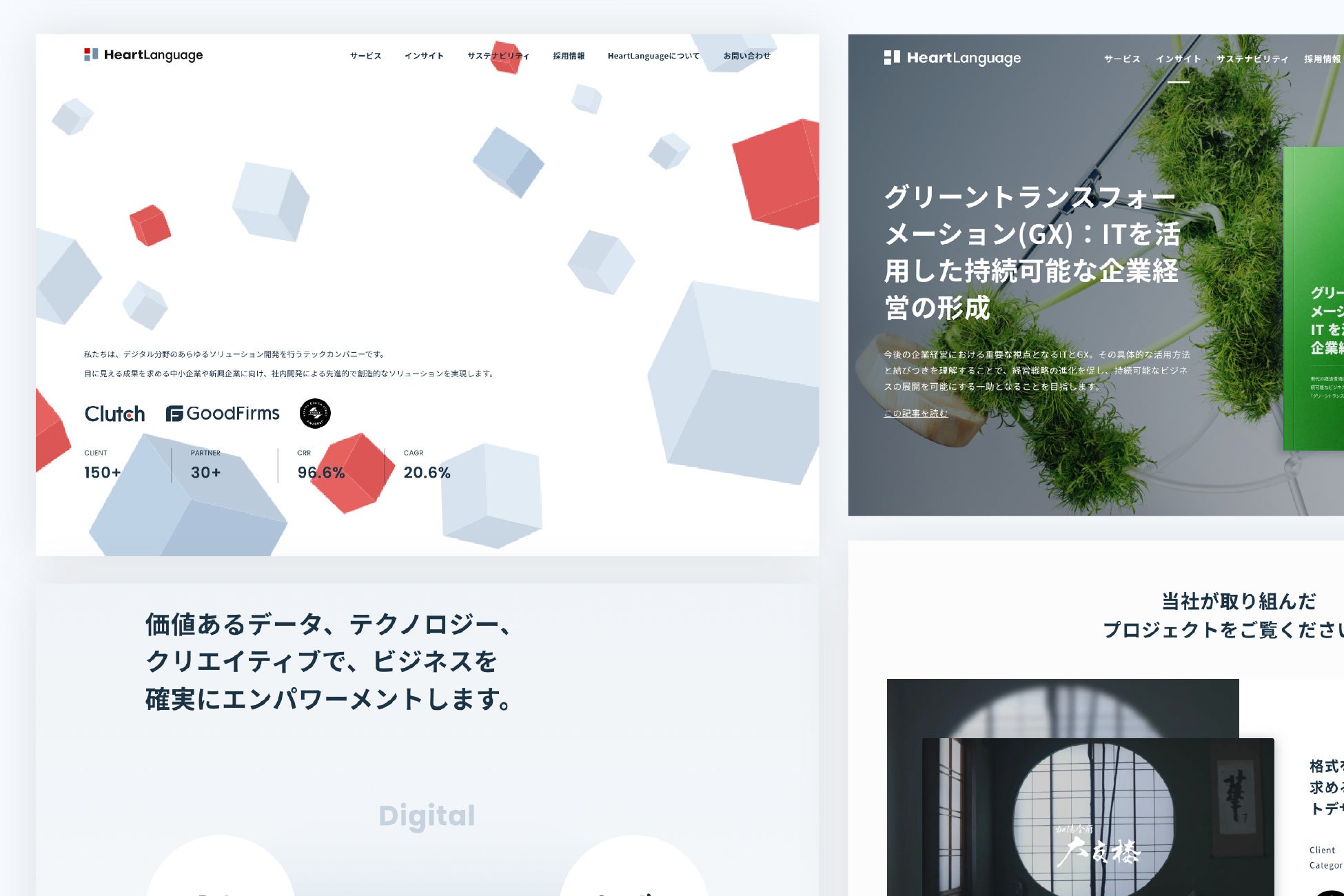 HeartLanguageの企業理念と提供するサービスについて詳しく説明したページを新たに追加し、訪問者が必要な情報にアクセスしやすいサイト構造に整えています。また、ビジュアルやレイアウトにブランドイメージとの一貫性を持たせることで、訪問者はHeartLanguageについてこれまで以上に深く理解できるようになっています。