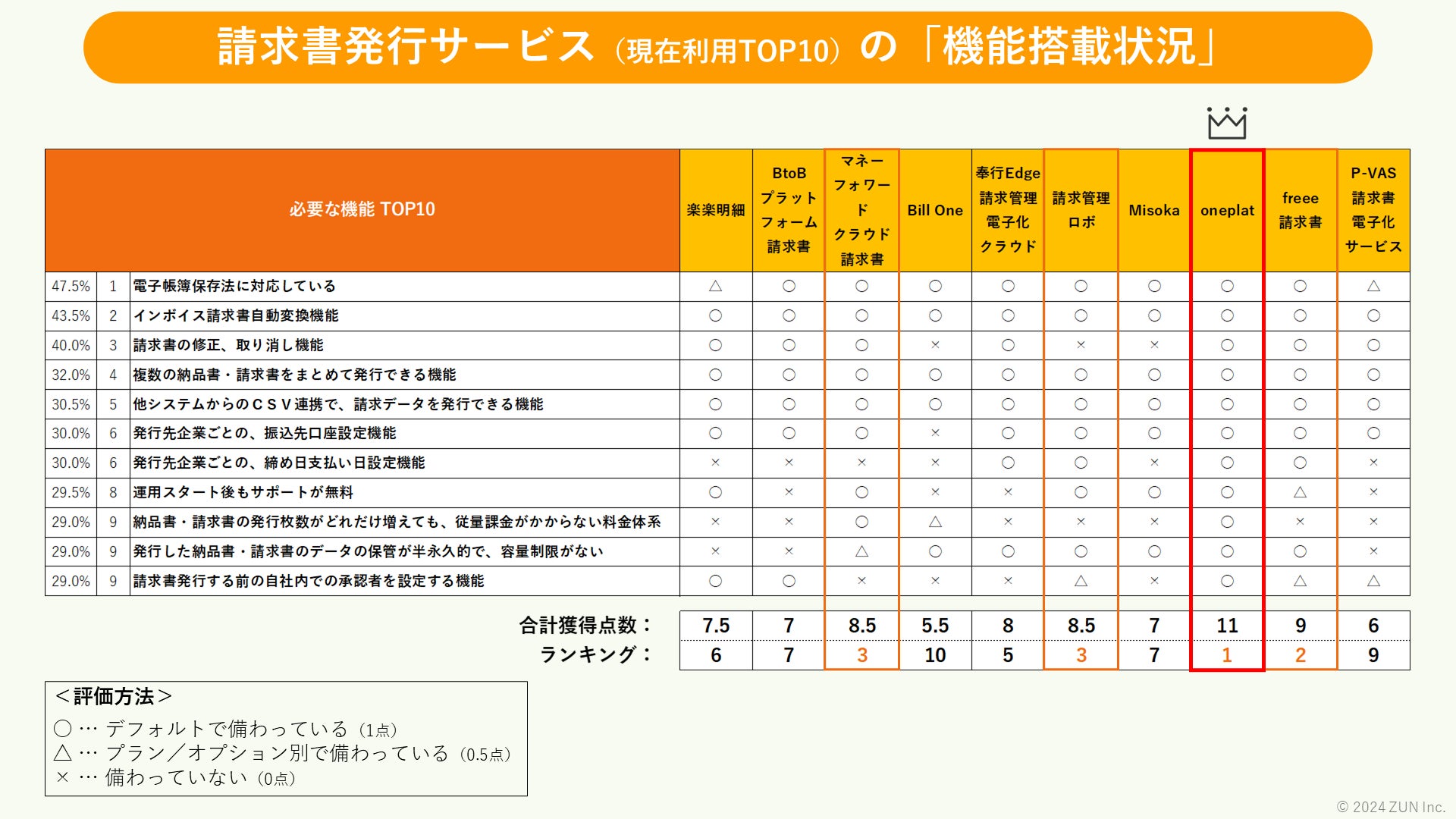 また、現在利用上位10位の請求書発行サービスについて、必要な機能TOP10(11機能)の搭載状況を調査した結果、総合得点で「oneplat」が1位を獲得しました。