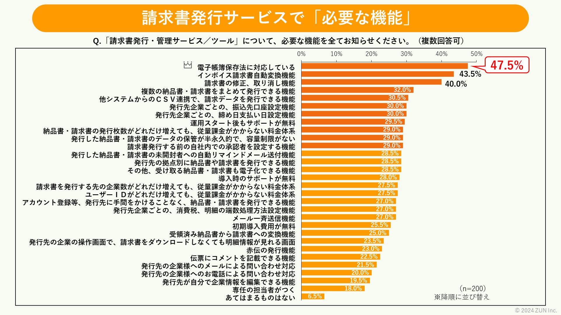 ①「請求書発行・管理サービス/ツール」の必要な機能、第1位は「電子帳簿保存法に対応」!「インボイス請求書自動変換」や「請求書の修正・取り消し」が上位に。