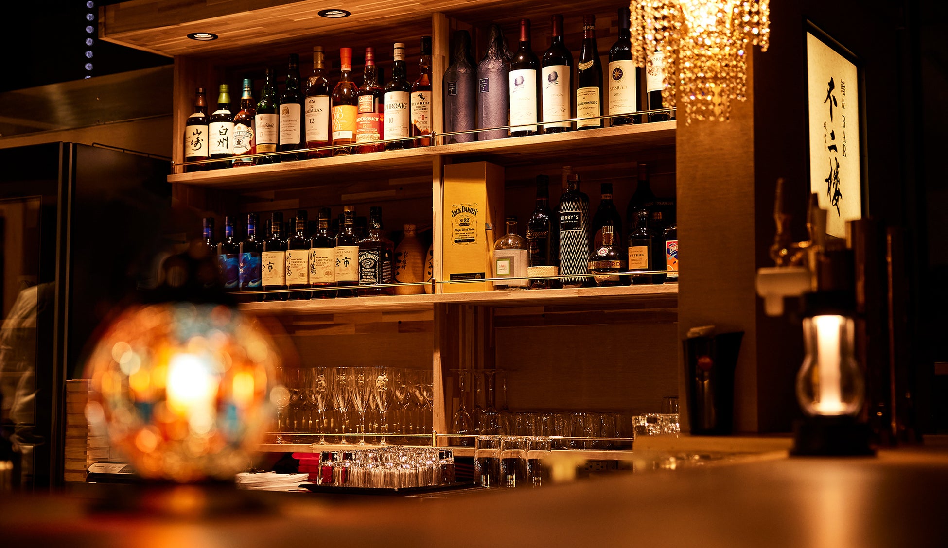 プレミアムワイン、日本酒、焼酎が並ぶ本格BARエリア