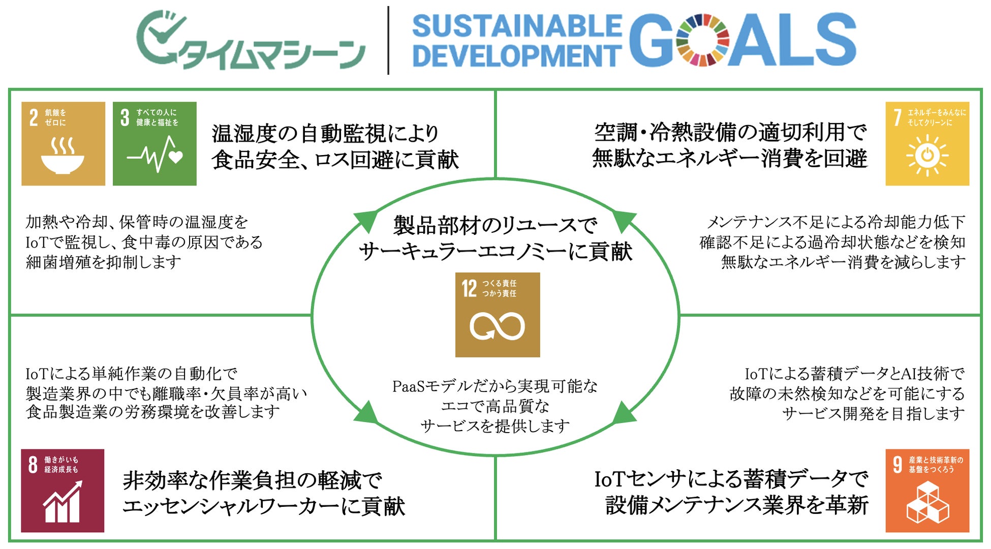 タイムマシーンは、SDGsに賛同し、主力サービスであるACALAシリーズの開発提供を通じて、SDG12「つくる責任 つかう責任」を中心として、2 「飢餓をゼロに」、3 「すべての人に健康と福祉を」、7 「エネルギーをみんなに そしてクリーンに」、8 「働きがいも 経済成長も」、9 「産業と技術革新の基盤をつくろう」の6つの目標に対して貢献します。