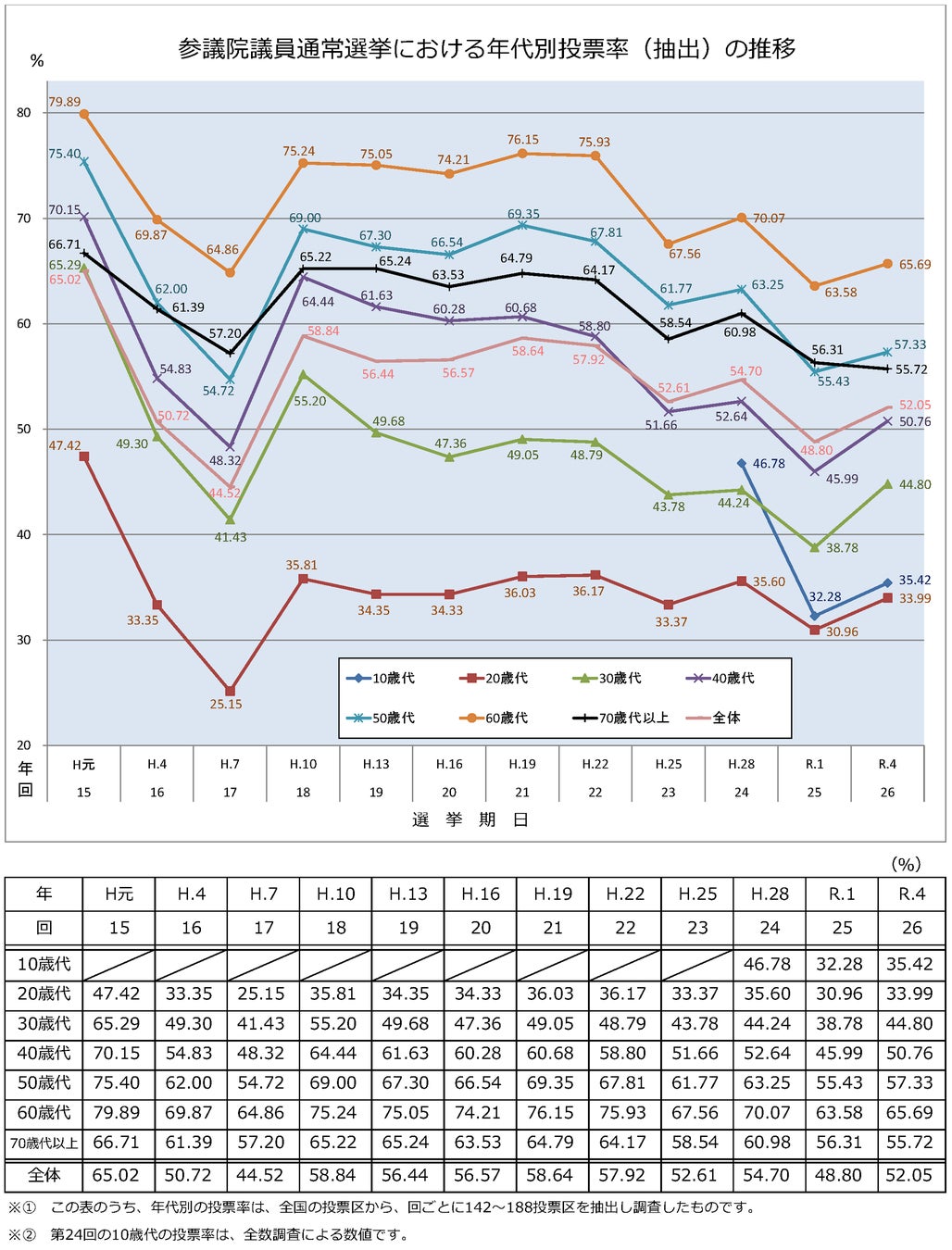 一方で「自分の声が届いていない」「投票しても変化がない」といった声もあり、選挙へ足を運ばない人が多いことも現状です。実際に、参議院選挙の投票率は依然として低水準を推移しており、特に10〜30代では50%を下回る状況が続いています。