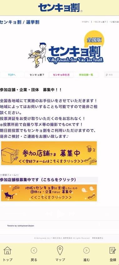 センキョ割の公式アプリは、サイト版で探しにくかった参加店舗を地図上で簡単に探せるように改良しています。